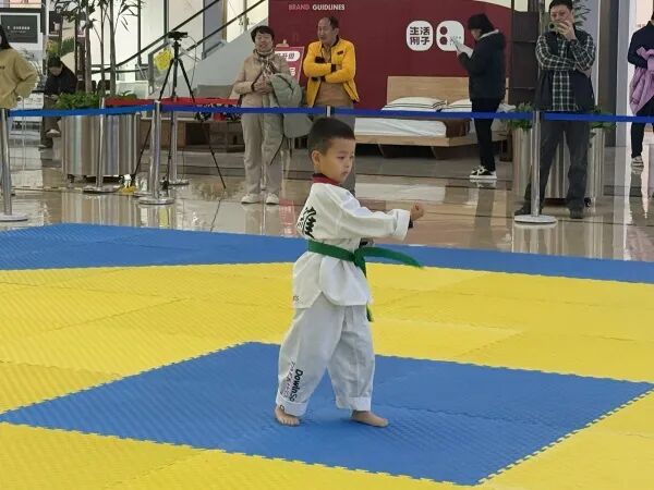 赛场上,身着统一道服的小运动员们精神抖擞、意气风发。品势比拼中,他们动作规范整齐、刚劲有力,踢腿、冲拳、转身等每一个动作都力求精准,既展现了跆拳道的刚健之美,又传递出对武道精神的理解与践行。幼儿组的小选手们虽年纪尚小,却丝毫不见怯意,眼神坚定地完成每一套品势动作,稚嫩的脸庞上满是认真;少儿组选手则在动作的力度与节奏把控上更显成熟,连贯的招式中透着一股不服输的韧劲,引得场边观众不时鼓掌叫好。