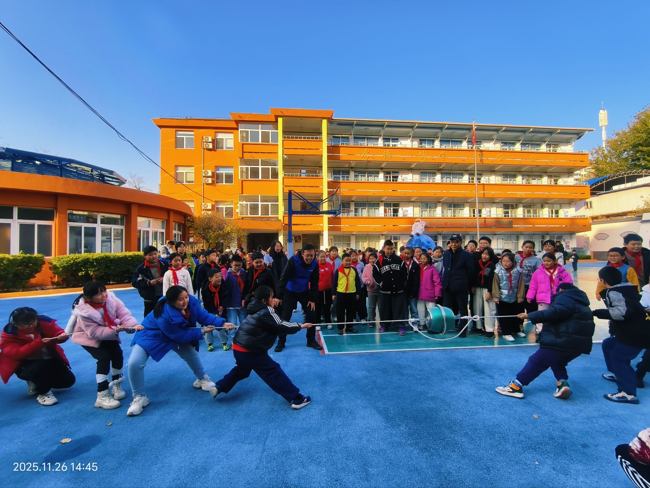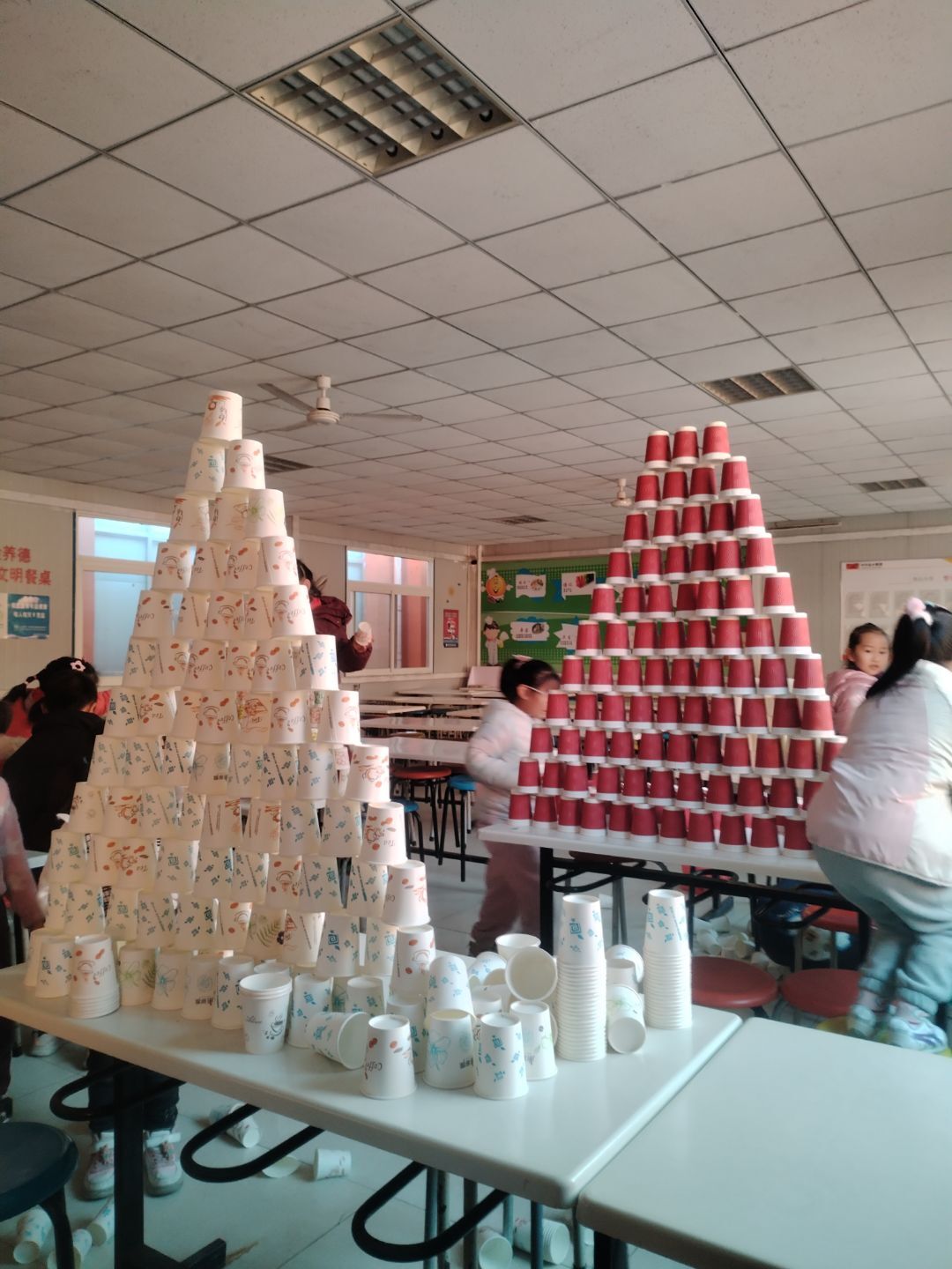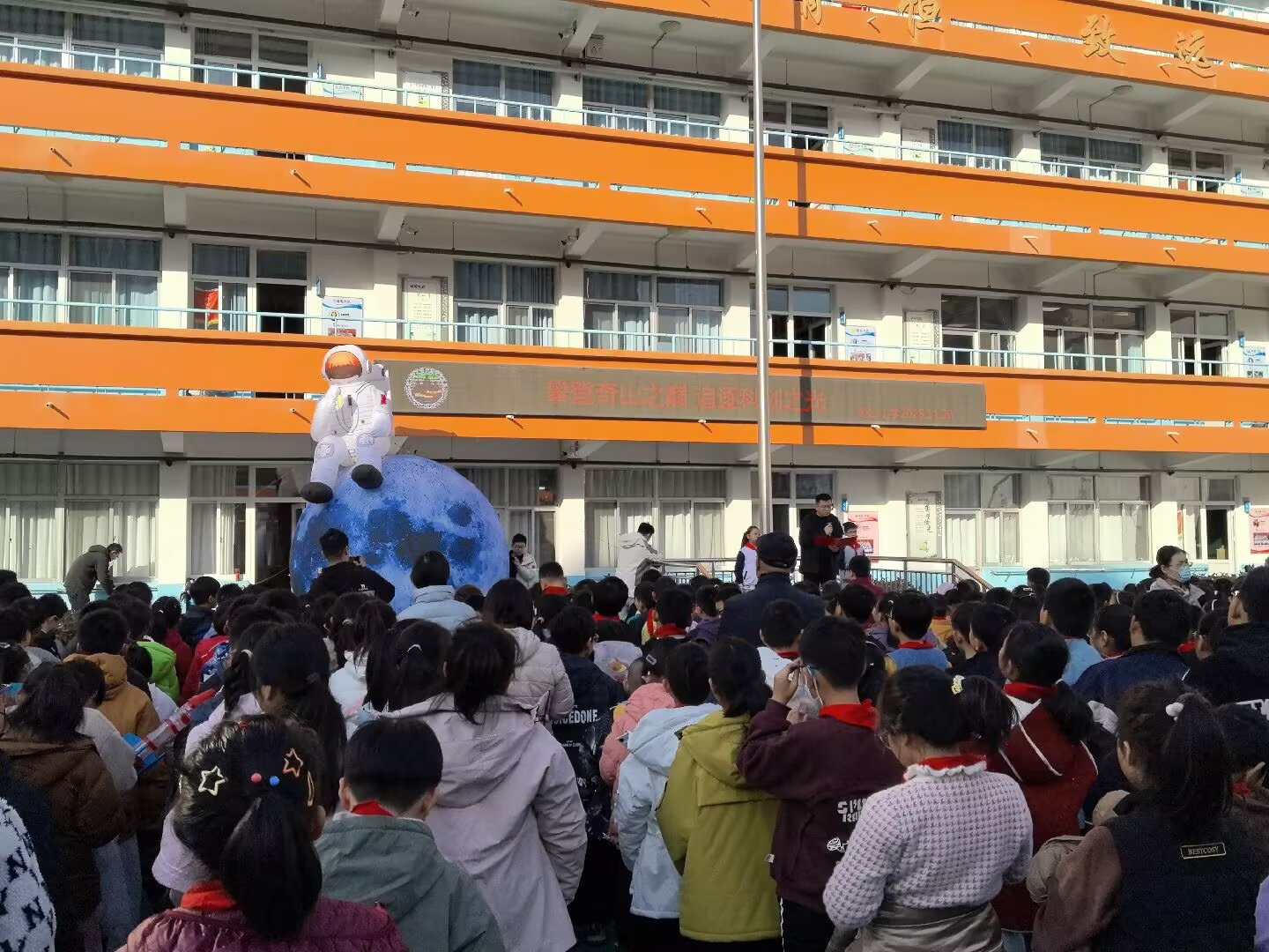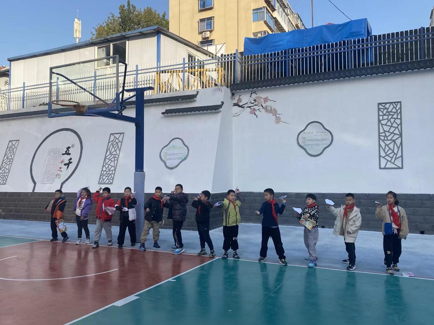 活动当天,各班级按比赛分组整齐列队,参赛队员们怀揣自制器材,精神抖擞地等待活动启动。开幕仪式后,在裁判老师的有序引导下,同学们分批前往西操场、一年级教室、食堂等指定场地,各项竞赛同步开展。低年级赛场童趣盎然,一、二年级学生在七巧板拼图中迸发巧思,用彩色板块拼出航天飞机、未来城市等创意图案;纸飞机与彩泥制作现场创意十足,孩子们用双手将想象转化为具象作品;空中坠蛋与纸杯搭建项目中,小选手们默契配合,在实践中探索力学原理。图