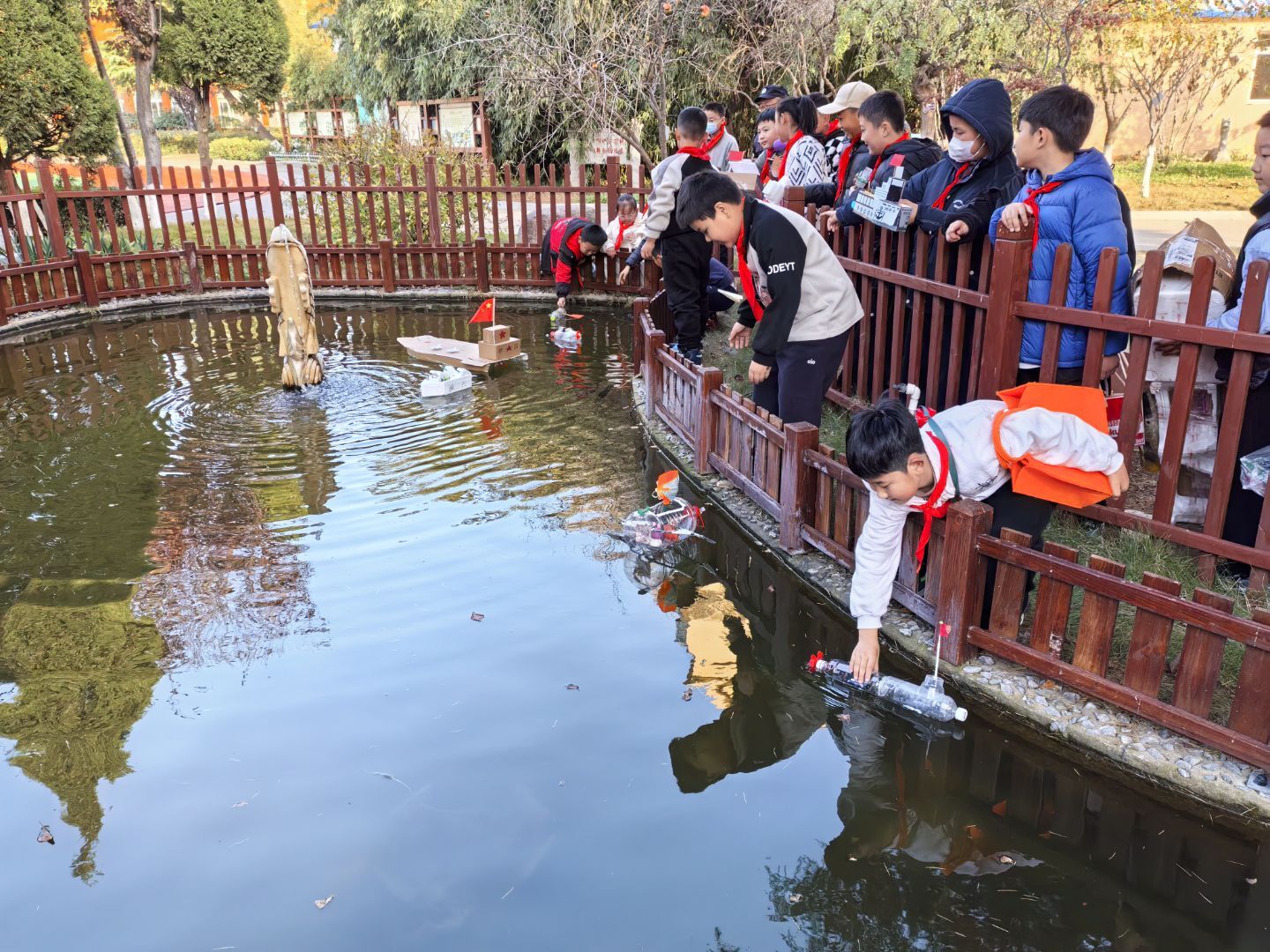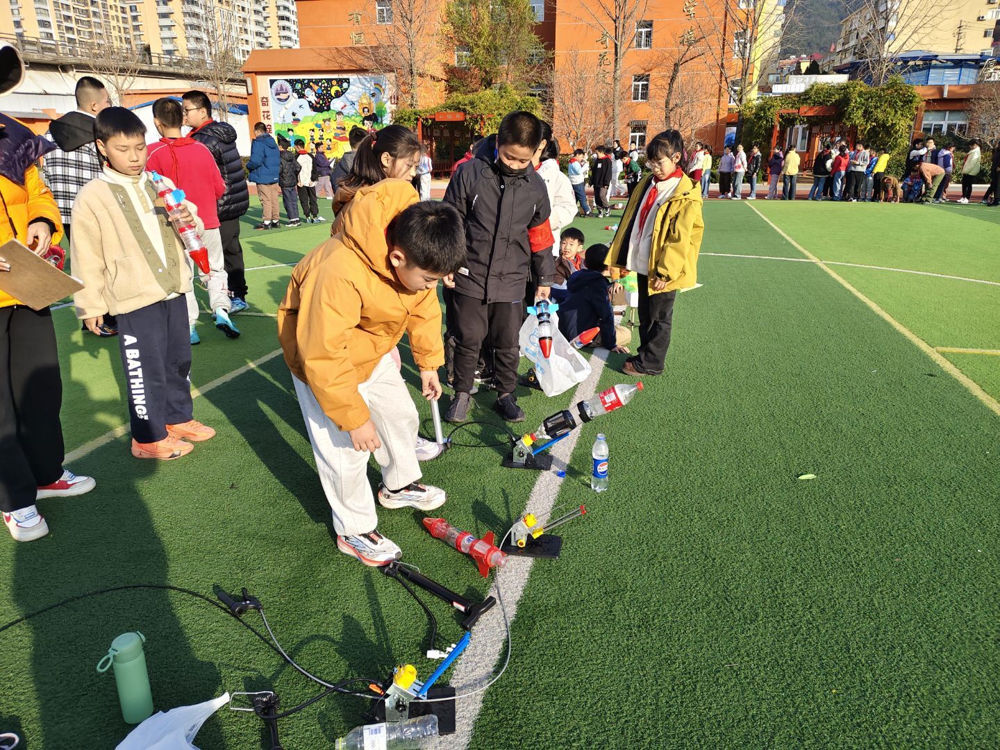 中高年级赛场竞技氛围浓厚,三至五年级学生在弹射飞机竞赛中比拼飞行技巧,创意魔方赛场指尖翻飞,尽显速拧与造型魅力;船模制作现场,同学们专注组装调试,让自制船模在水中稳健航行;水火箭项目更是将活动推向高潮,当满载创意的火箭直冲云霄,赛场响起阵阵欢呼,充分展现了同学们的工程思维与动手能力。