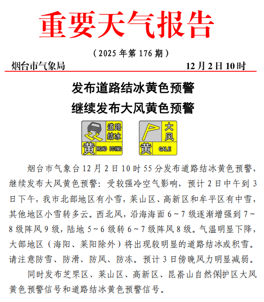 同时发布芝罘区、莱山区、高新区、昆嵛山自然保护区大风,黄色预警信号和道路结冰黄色预警信号。