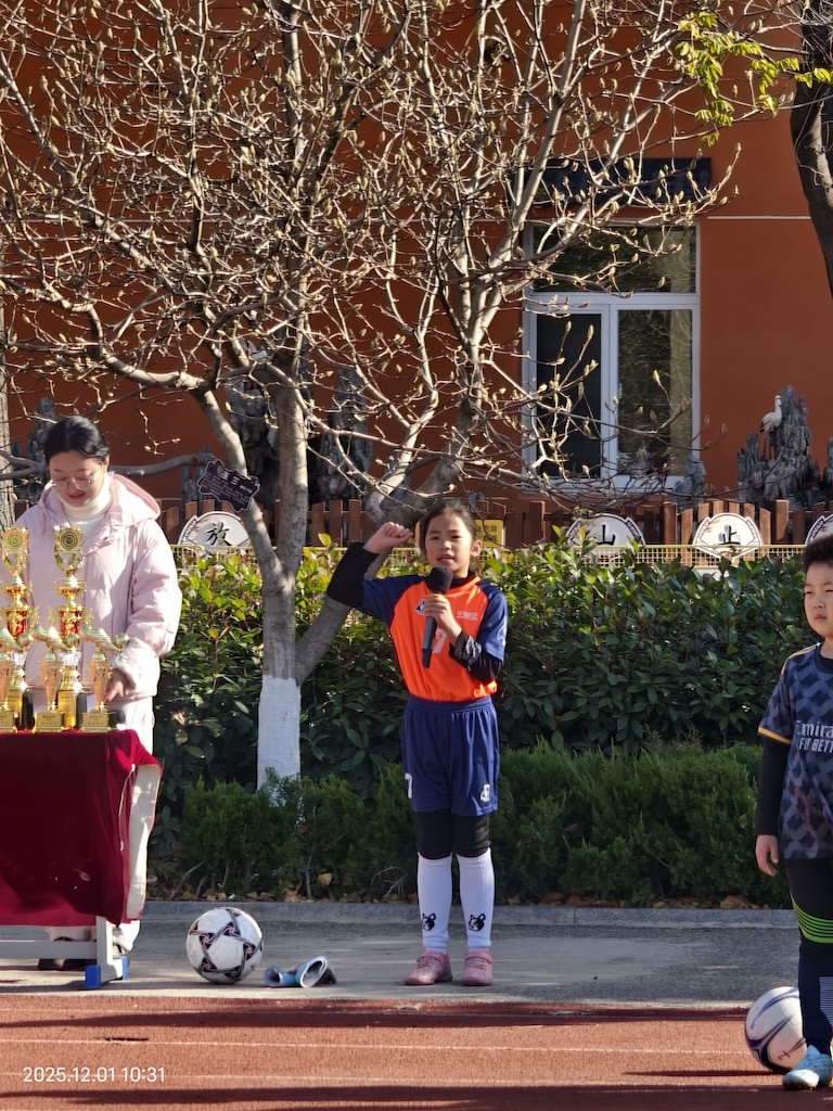 紧接着,刘萍萍书记为开幕式致辞。他首先肯定了学校作为足球特色校,在普及足球运动、弘扬体育精神方面所做的努力与取得的成果。他强调,足球运动所蕴含的团结协作、奋勇拼搏、永不言弃的精神,与学校的育人目标高度契合。刘书记寄语全体同学,以本次赛事为契机,积极投身运动,在锻炼中强健体魄,在拼搏中砥砺品格,并将赛场上的奋斗精神融入日常学习与生活,努力成长为德智体美劳全面发展的新时代好少年。致辞最后,刘书记郑重宣布:“校长杯”足球赛正式开幕!