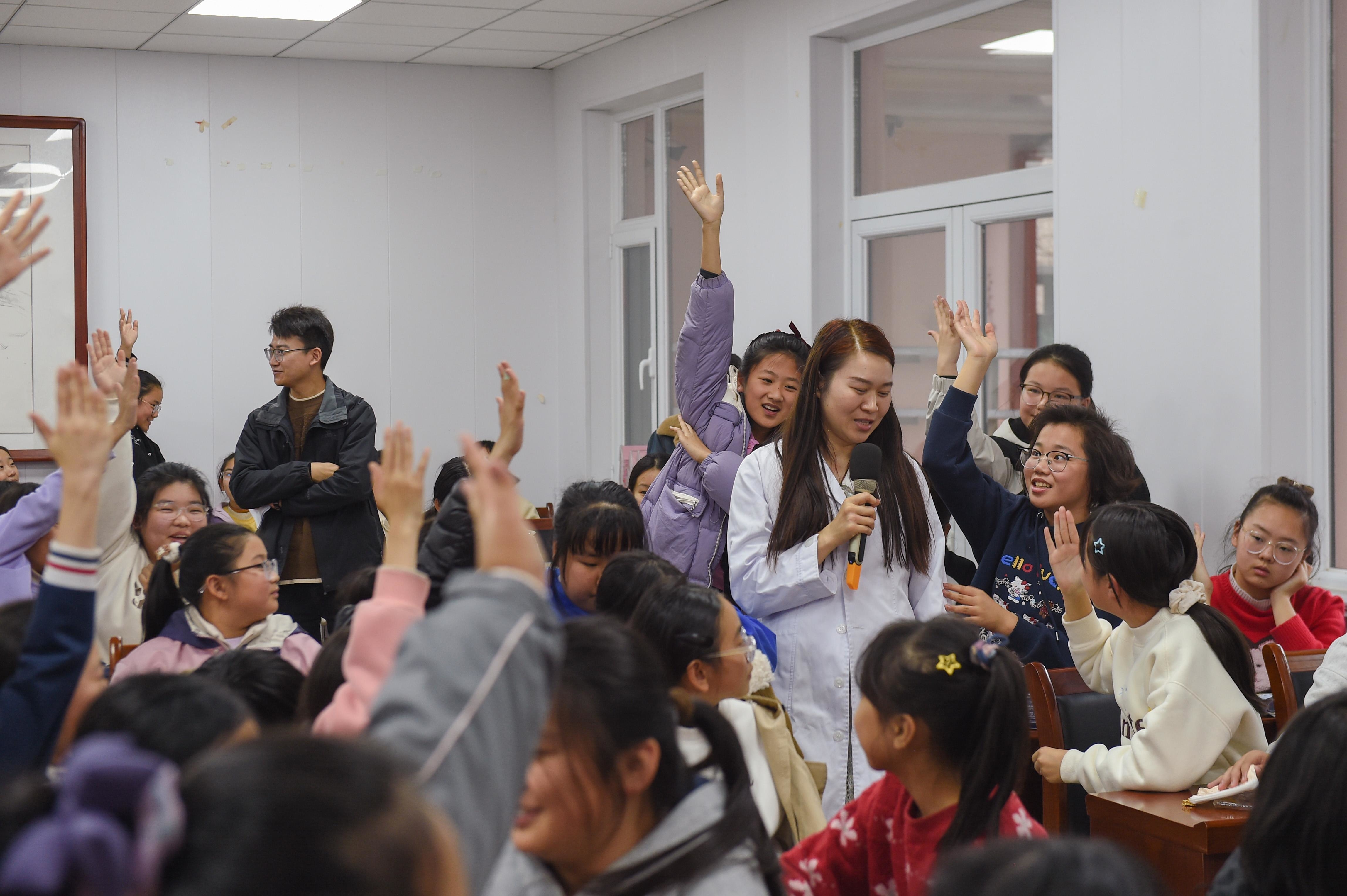 互动环节中,杨斌主治医师耐心细致地解答同学们提出的各类问题,现场还为大家赠送健康科普资料与定制小礼物,充分调动了学生的参与热情,课堂气氛热烈活跃。期间,林爱敏与杨斌共同带领同学们完成互动实验,让抽象的生理知识变得具象可感。