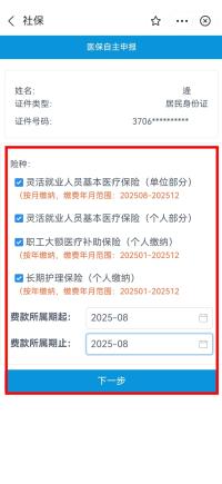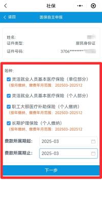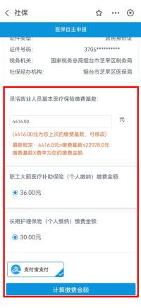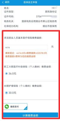 2.微信缴费操作流程:微信小程序搜索“山东税务社保费缴纳”——灵活就业——医保自主申报——选择缴费人员——选择灵活就业人员基本医疗保险、职工大额医疗补助保险、长期护理保险三个险种缴费——费款所属期——填写缴费基数——完成缴费。