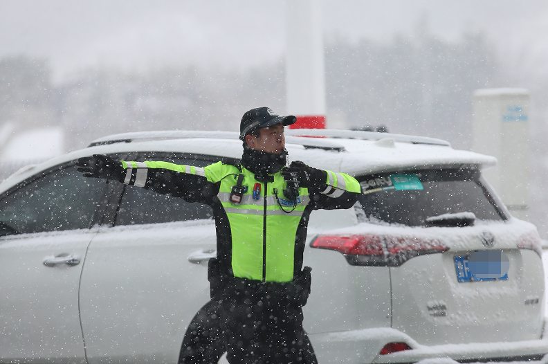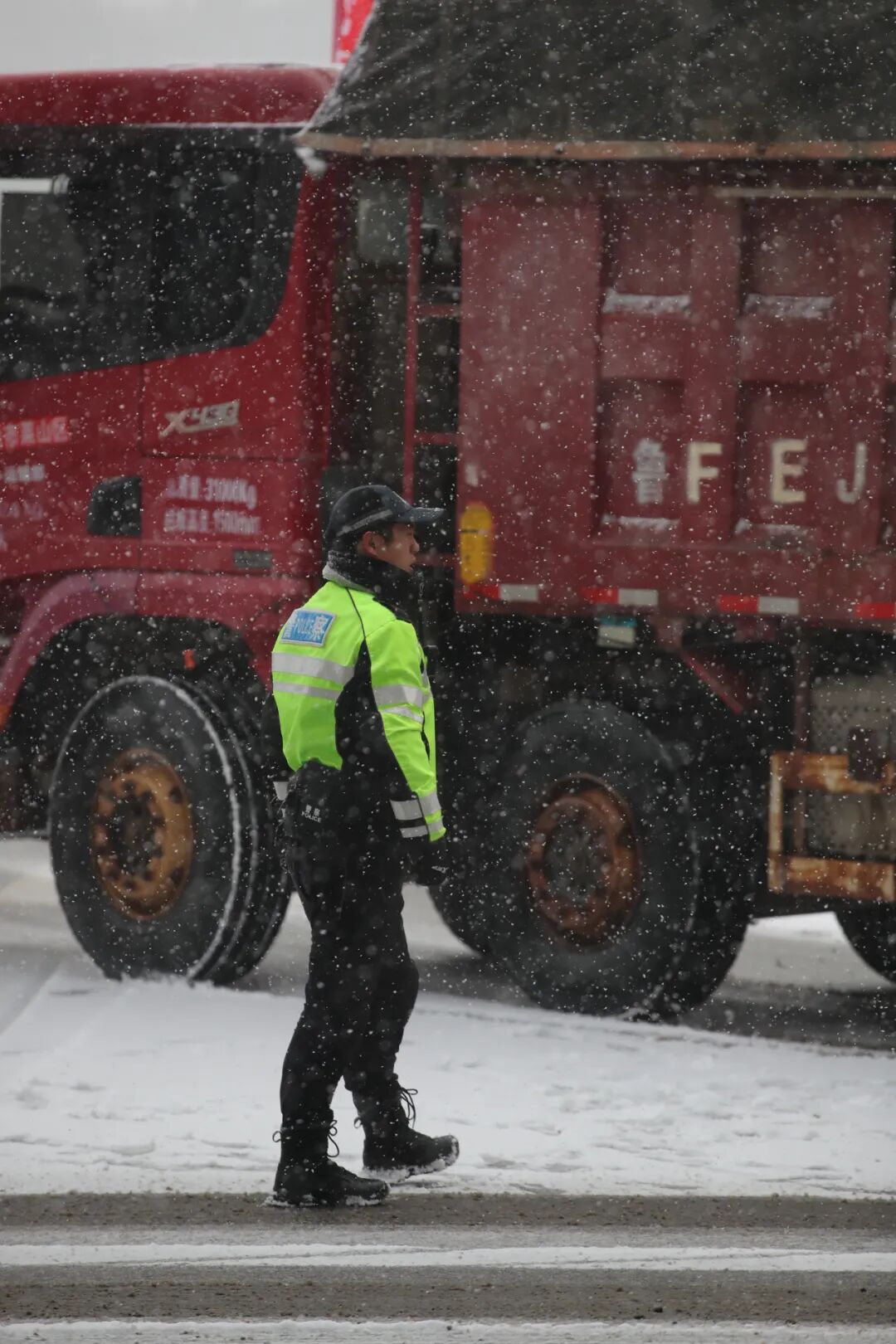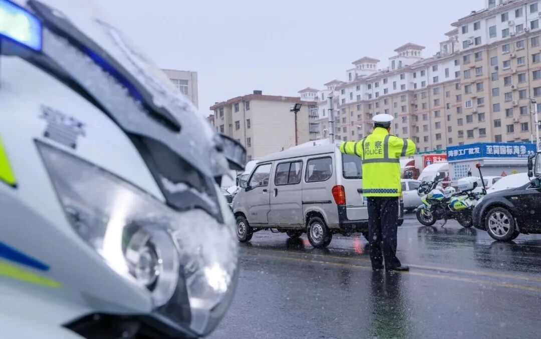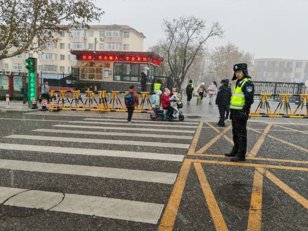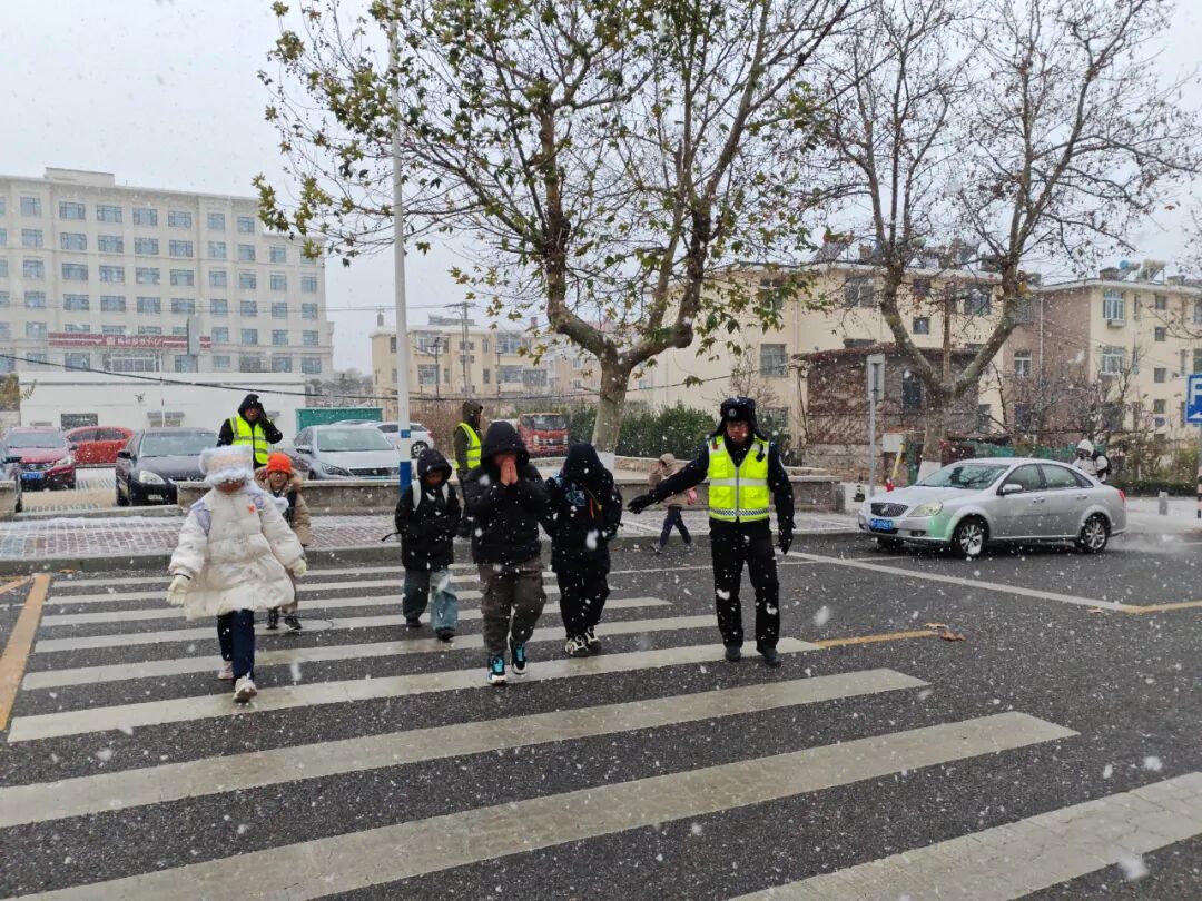 图/烟台市公安局长岛分局交警大队民辅警雪中“护学”,确保校园周边道路交通安全畅通。