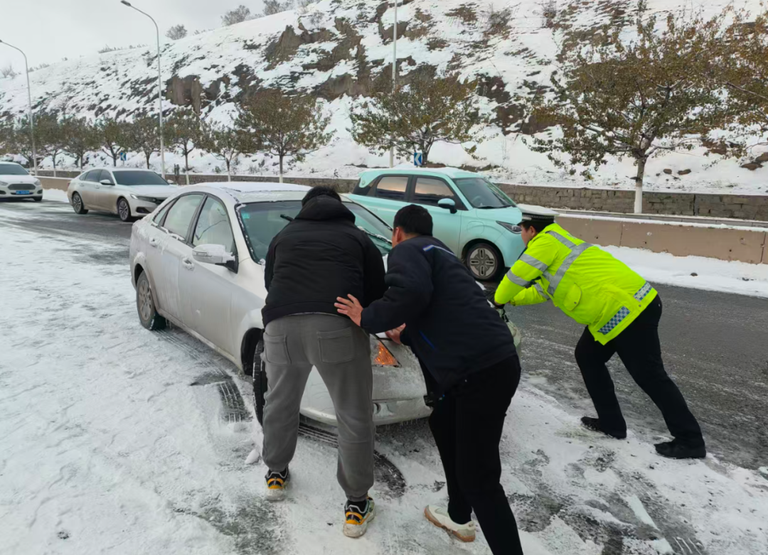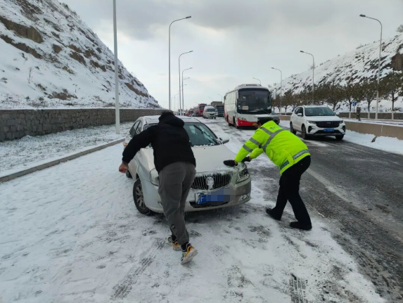 图/雪天路滑,烟台市公安局黄渤海新区分局巡逻警力帮助受困车辆脱困。