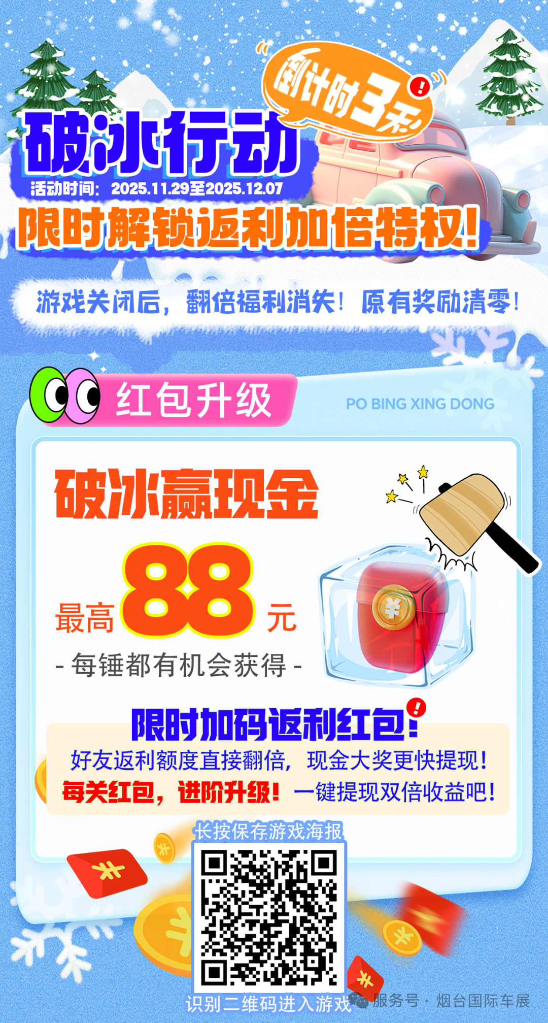 参与互动游戏,即可获得开红包活动资格,现金红包至高88元,还能“锤”出精美礼品。(礼品数量有限,先兑先得~)