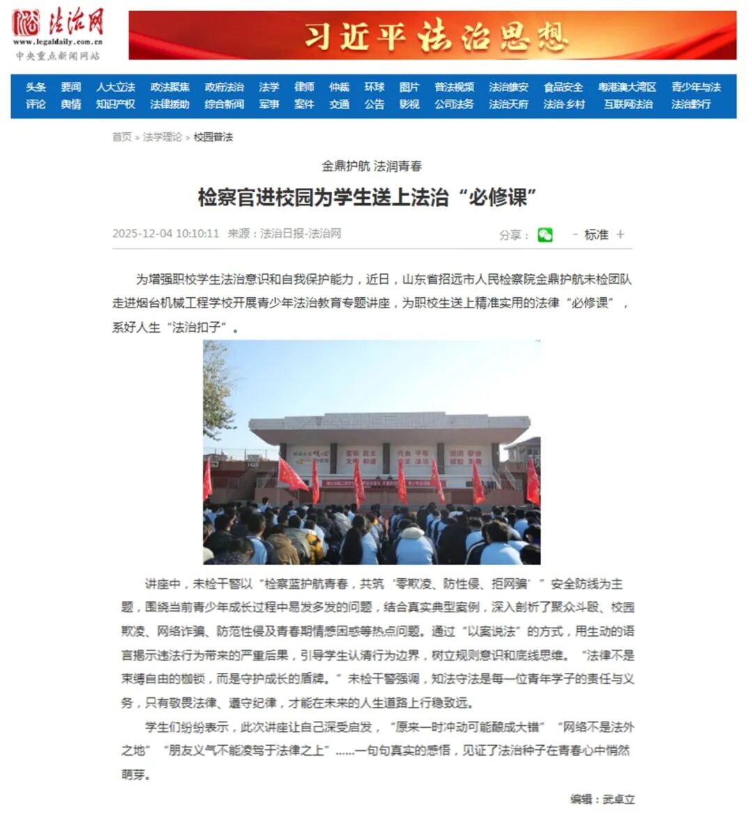 12月4日,《法治日报-法治网》刊发招远市检察院题为《金鼎护航 法润青春 检察官进校园为学生送上法治“必修课”》的稿件。