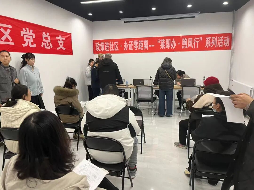 12月5日上午,金滩社区党群服务中心里格外热闹。一场名为“煦风行·莱即办”的政策服务活动正在这里举行,把不动产办证的服务窗口直接开到了居民们的“家门口”。