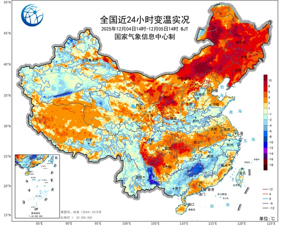 12月初的寒潮影响结束后,我国大部地区气温持续回升中,今天的变温实况图都是大片的暖色调。内蒙古和东北地区升温最明显,部分地区升温超过了10℃。