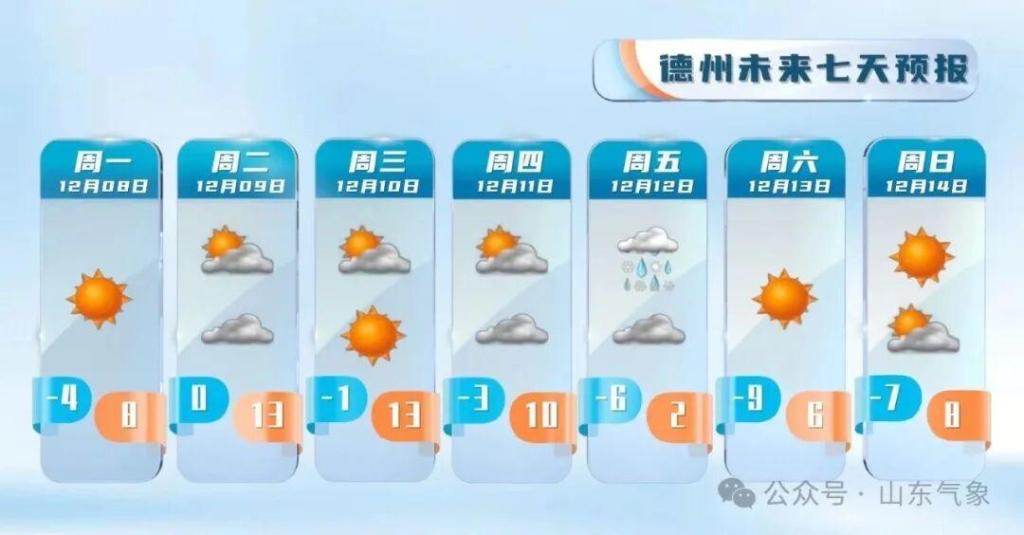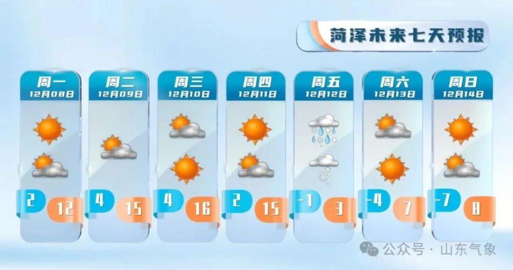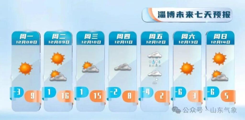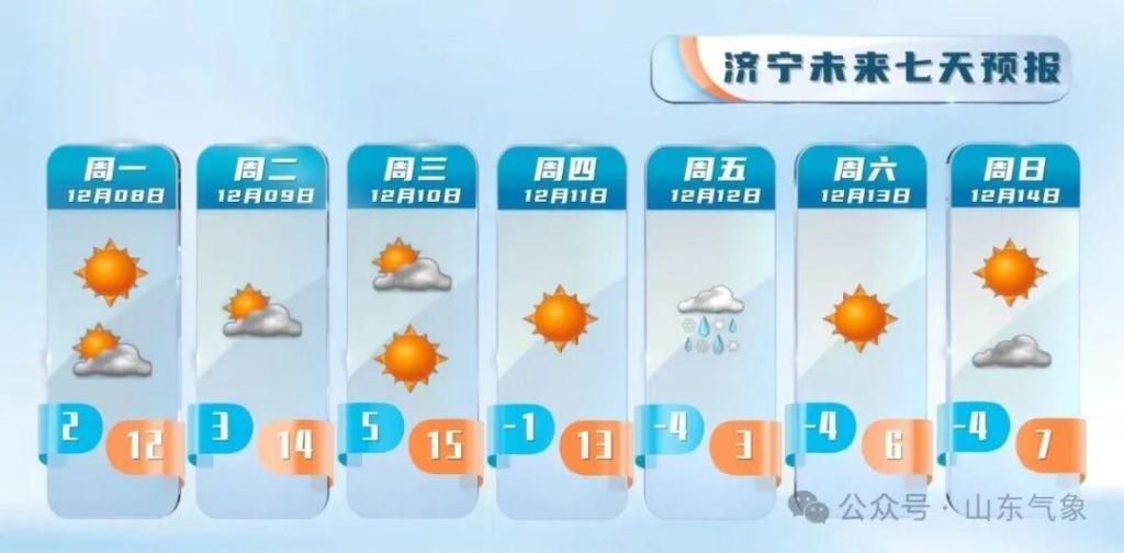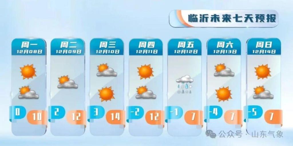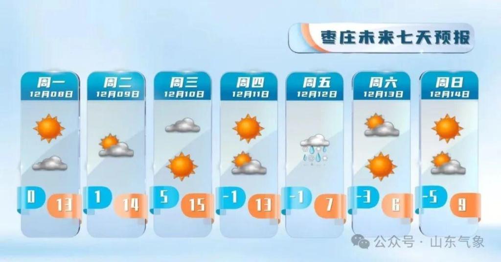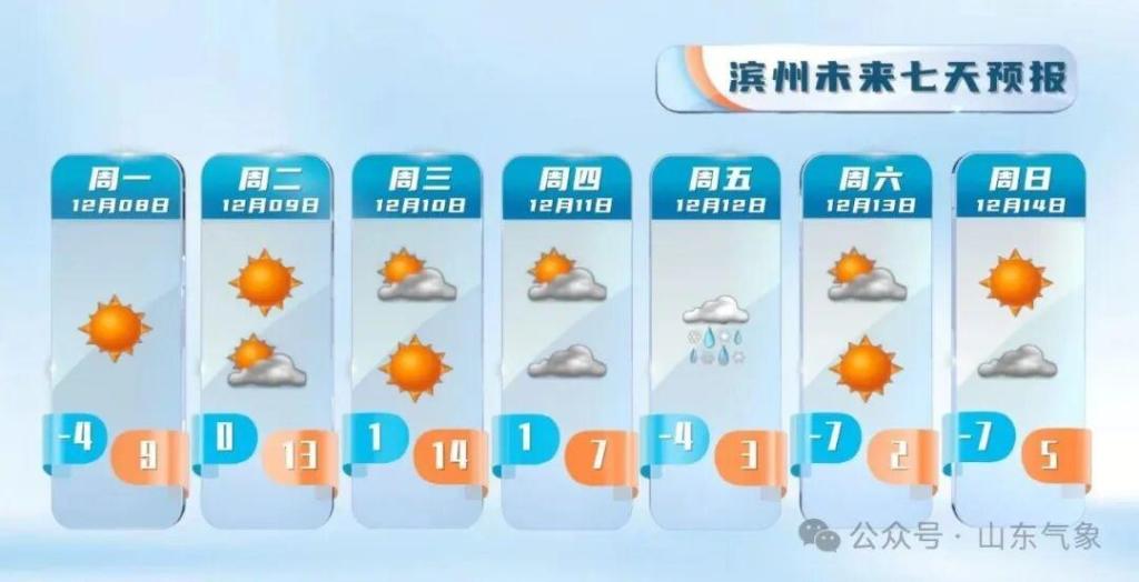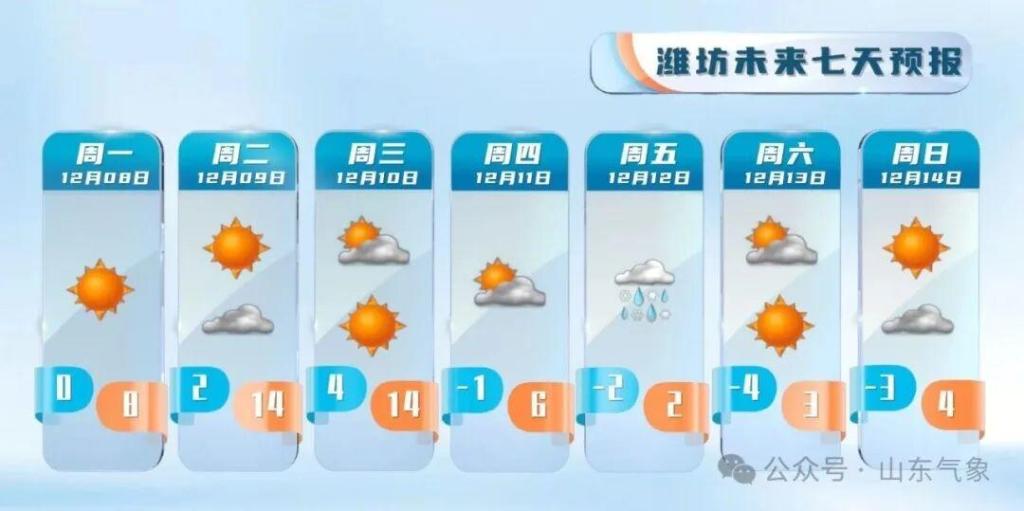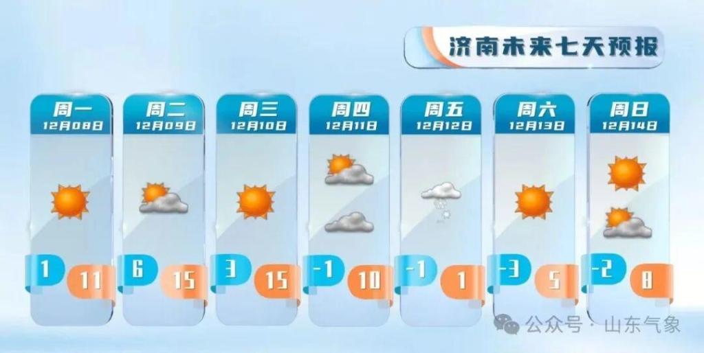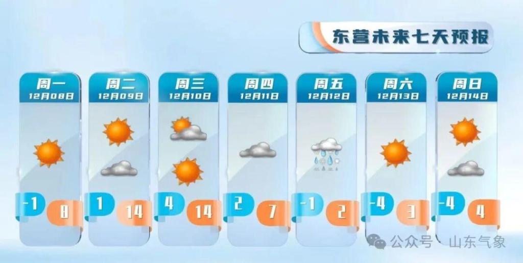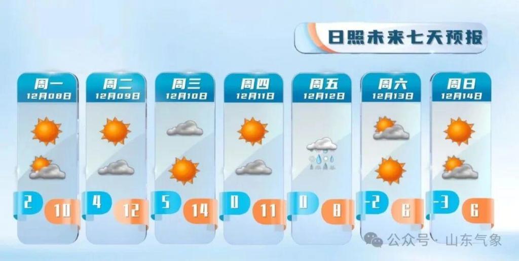 8日(周一),全省天气晴到少云。北风转南风3级左右。夜间最低气温:滨州、东营、鲁中山区和半岛地区-2℃左右,其他地区1℃左右。最高气温:聊城和鲁南地区10℃左右,其他地区7℃左右。