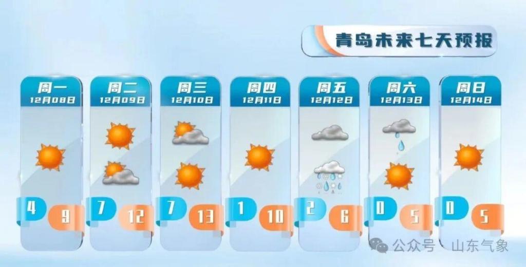 10日(周三),半岛地区多云间阴局部有小雨,其他地区天气晴转多云。滨州、东营、潍坊、日照、半岛地区和内陆湖面南风3~4级转北风5~6级阵风7~8级,其他地区南风2~3级转北风4~5级阵风6~7级。夜间最低气温:鲁中山区和半岛内陆地区-2℃左右,鲁南和沿海地区3℃左右,其他地区1℃左右。最高气温:鲁中山区10℃左右,其他地区13℃左右。