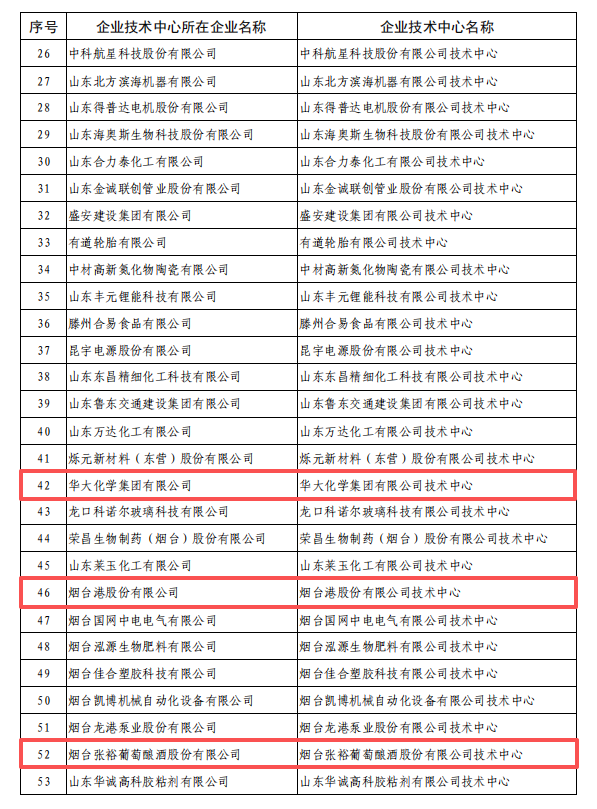 近日,山东省发展和改革委员会公布了2025年山东省企业技术中心认定名单,芝罘区烟台港股份有限公司、烟台张裕葡萄酿酒股份有限公司、华大化学集团有限公司等三家企业的技术中心成功入选,入选数量位列全市第1。目前,芝罘区共有国家级企业技术中心6家、省级企业技术中心16家。