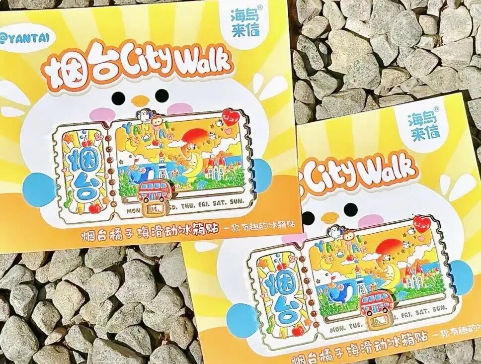 “八仙护佑”系列是海岛来信文创产品中的畅销品,创作灵感来源于八仙过海传说,旋转的八仙将神话传说与吉祥寓意用一种轻松有趣的方式呈现。而另一款畅销品“票根系列”冰箱贴,则是城市风貌的符号化集成:复古的票根造型,融合了烟台山灯塔、月亮湾、17路巴士等烟台元素,这种“一贴览全城”的创意,极大地满足了人们收集城市印象的需求,成为游客带走“完整烟台”的绝佳载体。