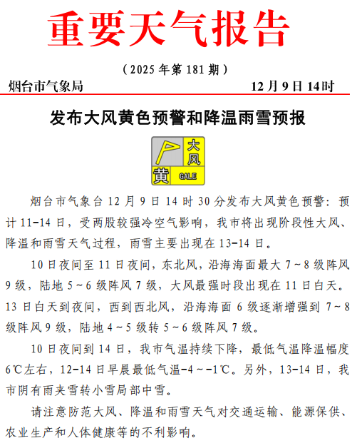 预计11-14日,受两股较强冷空气影响,我市将出现阶段性大风、降温和雨雪天气过程,雨雪主要出现在13-14日。