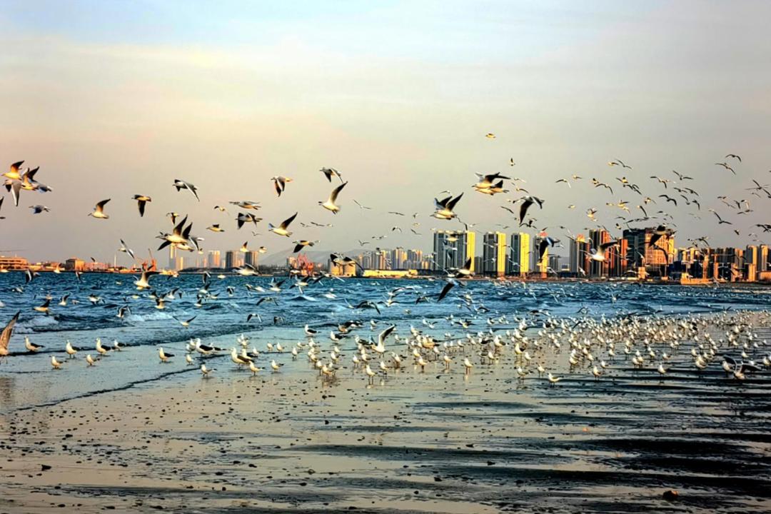 烟台高新区粉色沙滩上,成群的海鸥盘旋翱翔,时而轻点水面,时而低空嬉戏,洁白羽翼与沙滩相映成趣。海风轻拂,浪花低语,鸥鸣阵阵,这幅兼具浪漫与生机的画面,成为高新区最治愈的风景线,定格下海岸独有的灵动与美好。 林乐江 摄