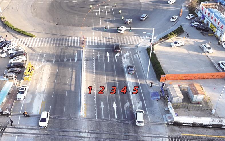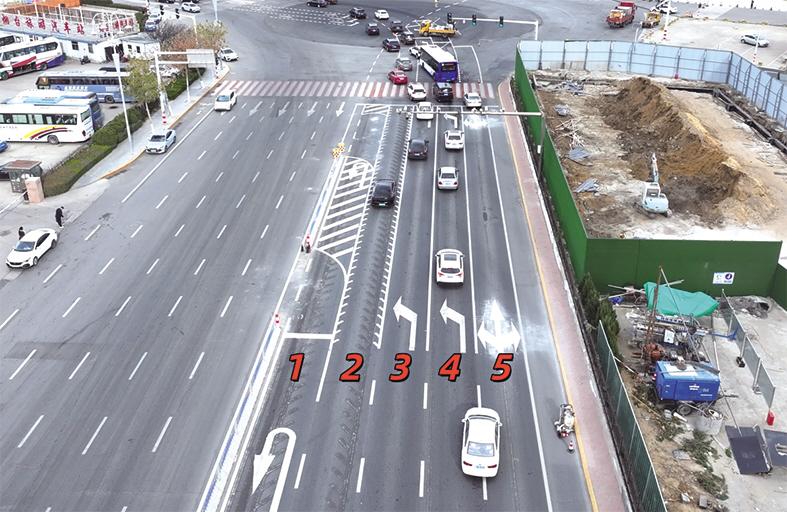 由原来的“三进五出”优化为“五进五出”,新增四条左转待转区。