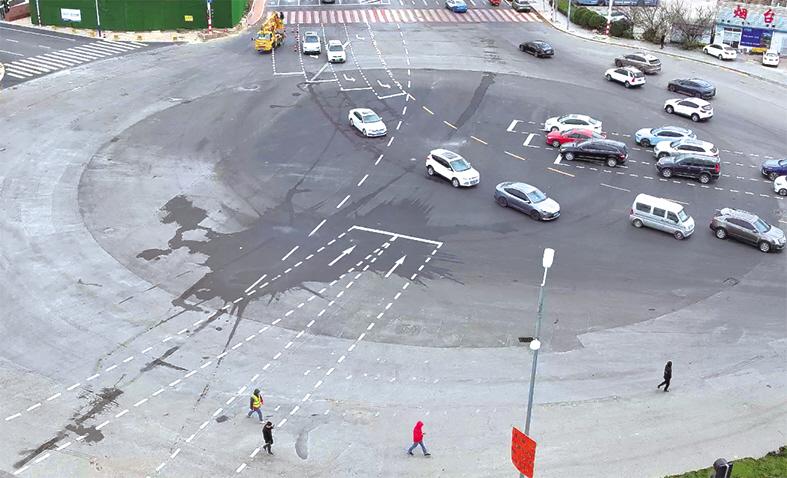 市政有关部门拆除南北两侧绿化带后,进出口车道数由原来的“三进三出”优化为“五进四出”,新增三条直行待行区,直行车辆根据信号灯提示进入待行区,可以有效减少路口压车阻碍右转车辆通行的情况。