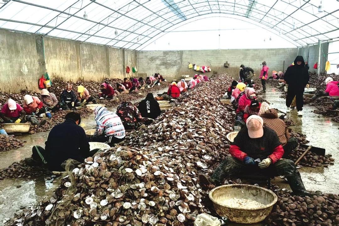 连日来,烟台高新区北寨村养殖场里,扇贝堆积如山,工人手指翻飞,巧剥鲜贝丁,好一幅生动的丰收图。林乐江 摄
