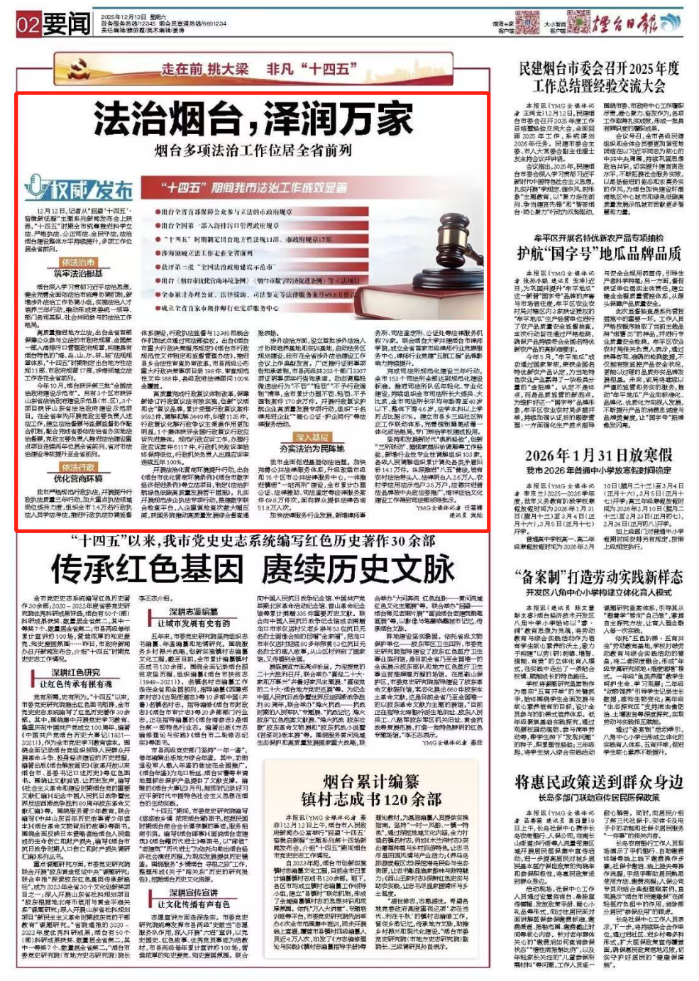 12月12日,记者从“回望‘十四五’·奋楫新征程”主题系列新闻发布会上获悉,“十四五”时期全市统筹推进科学立法、严格执法、公正司法、全民守法,法治烟台建设整体水平持续提升,多项工作位居全省前列。