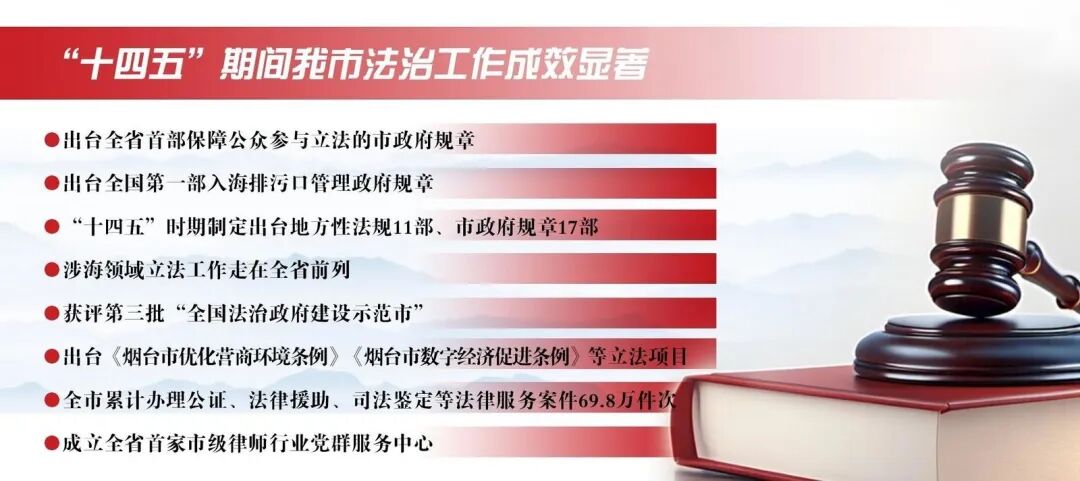 高质量推进地方立法,出台全省首部保障公众参与立法的市政府规章、全国第一部入海排污口管理政府规章,构建具有烟台特色的“海、岛、山、水、林、城”法规规章体系,“十四五”时期制定出台地方性法规11部、市政府规章17部,涉海领域立法工作走在全省前列。