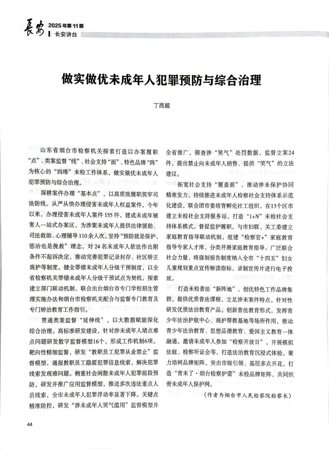 『编者按』近日,中共中央政法委员会主管的《长安》杂志于2025年第11期“长安讲台”栏目刊发由烟台市检察院党组书记、检察长丁西超撰写的理论文章《做实做优未成年人犯罪预防与综合治理》。