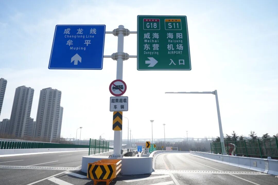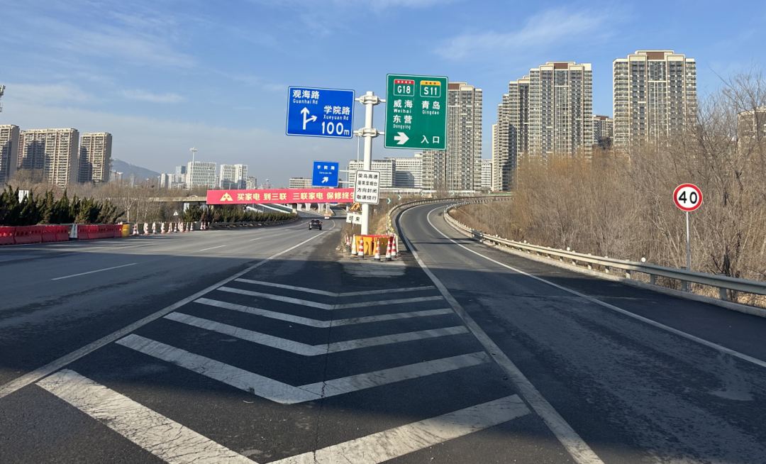 由北向南会经过两个匝道口,第①个匝道口,直行主路通往成龙线、牟平方向,右拐匝道通往学院路方向。