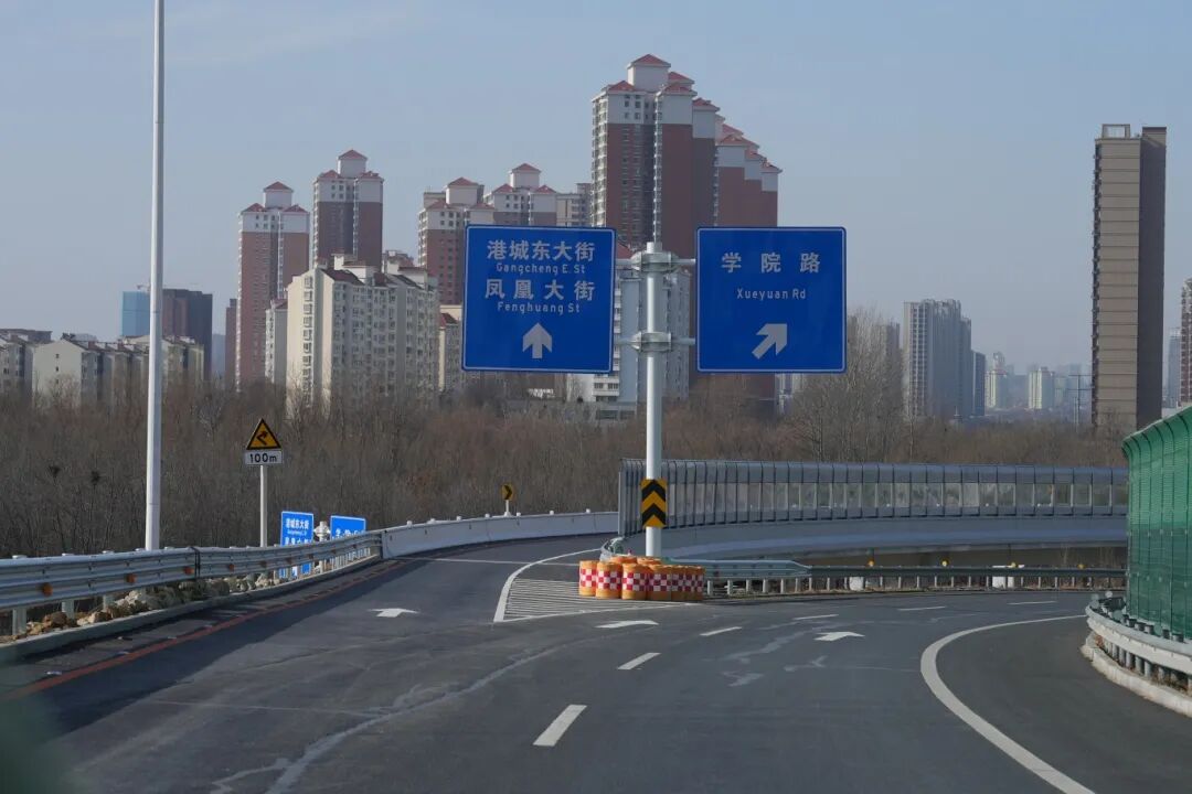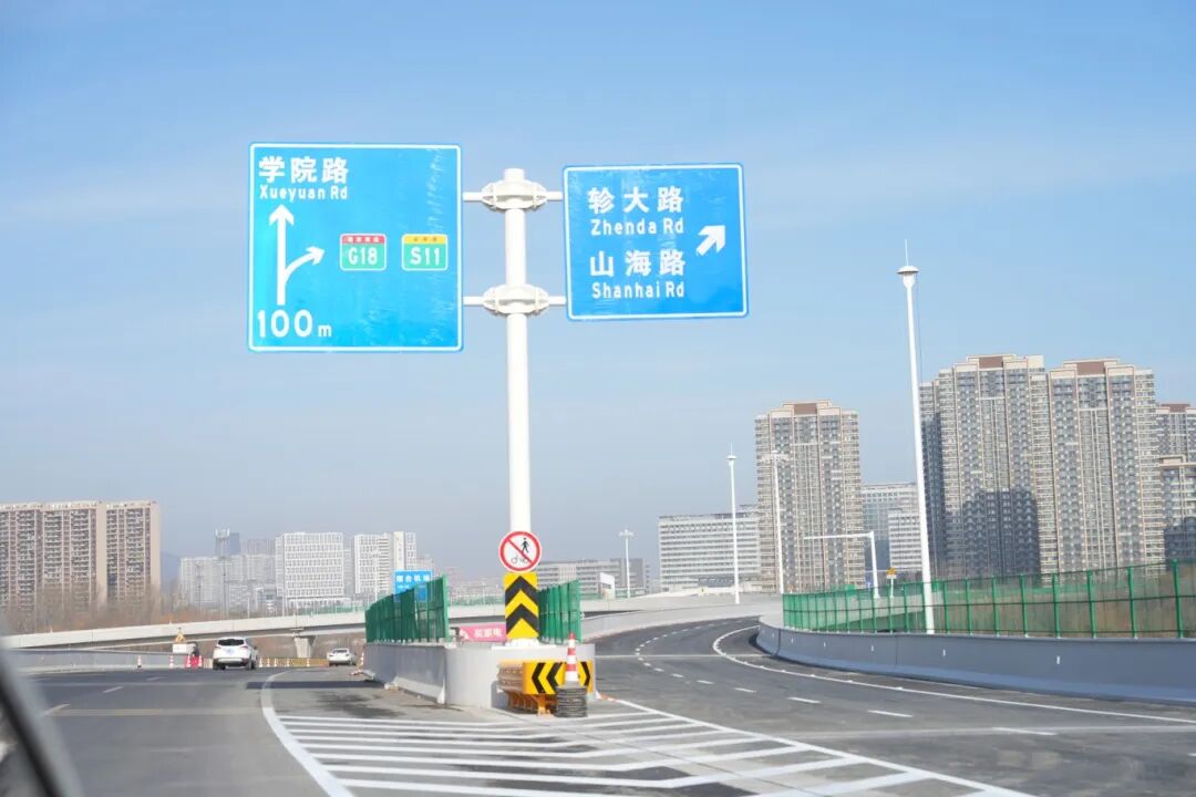 12月15日,轸格庄立交与周边道路衔接工程观海路跨学院路主线桥及进出高速匝道和轸大路连接成龙线的两条匝道开放通车。
