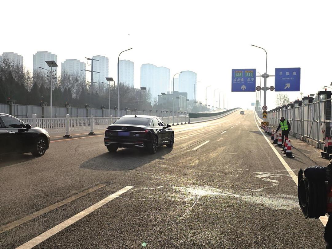 上午8点50分,记者来到轸格庄立交观海路-学院路跨线桥,看到红白两色反光锥围挡中,工人们正对路面进行清理,洒水车不时进出喷淋除尘,为跨线桥开放通行进行最后的扫尾工作。
