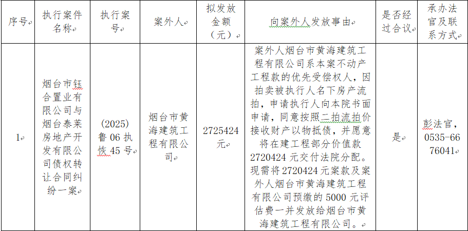 为进一步严格执行案款管理,规范执行案款发放程序,确保执行案款发放安全,根据最高人民法院《关于执行款物管理工作的规定》等相关规定要求,现对以下执行案款发放事宜进行公示,公示期为三个工作日(2025年12月17日-12月19日),案件当事人或者其他利害关系人如有异议应当在公示期内提出并提交相关证据材料,公示期满无异议的,本院将按照执行案款管理的相关规定办理发放手续。