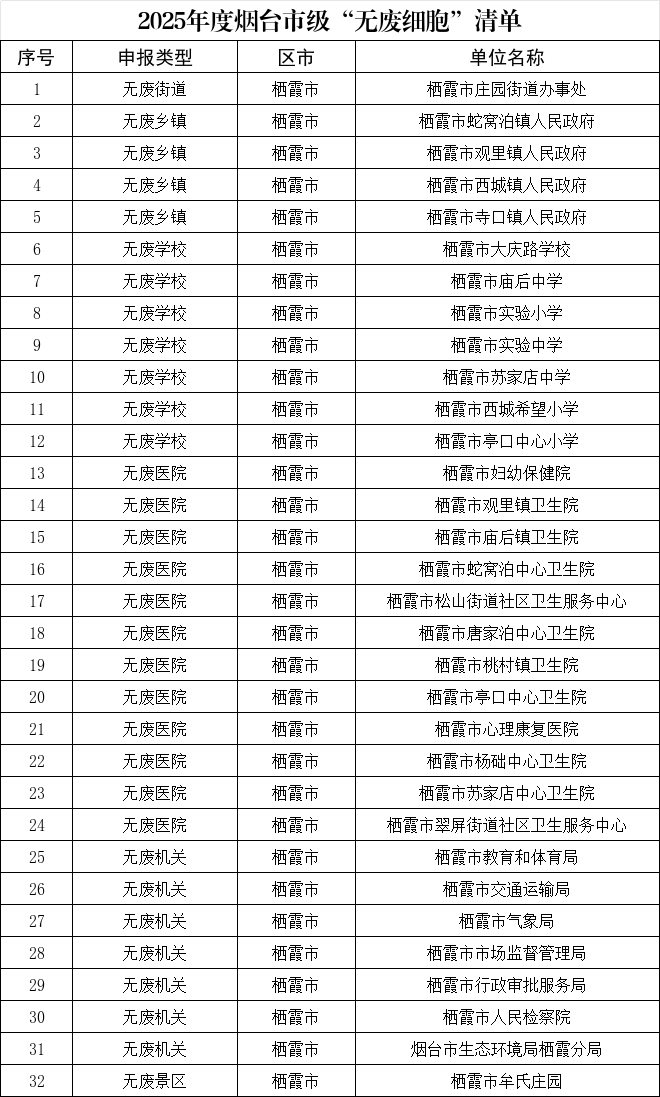 近日,2025年度烟台市级“无废细胞”名单公布,栖霞市32家单位荣登榜单。