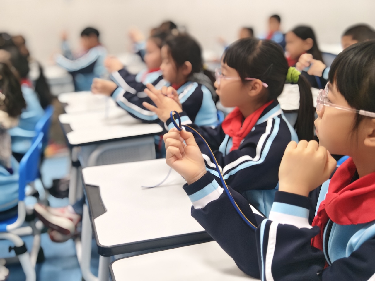 课堂上,孙老师首先讲述了盘扣的历史发展与文化内涵。随后,在老师手把手的指导下,孩子们饶有兴致地学习基本技法,一根根彩绳经过巧手盘绕,逐渐变成精美的结扣。现场气氛热烈,孩子们在实践中切身感受到了指尖上的传统之美。