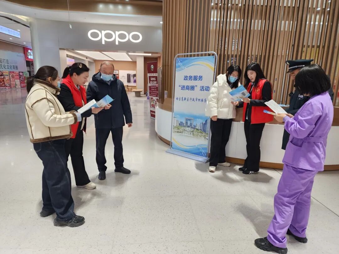12月17日上午,烟台高新区行政审批服务局变“被动审批”为“主动服务”,组织业务骨干走进高新城市广场,开展政务服务“进商圈”专项宣传活动。本次活动旨在聚焦市场主体全生命周期高频需求,将集成化、精准化的办事指引与服务窗口直接延伸到经营一线,推动商户和群众办事从“能办”向“好办、易办、快办”转变。
