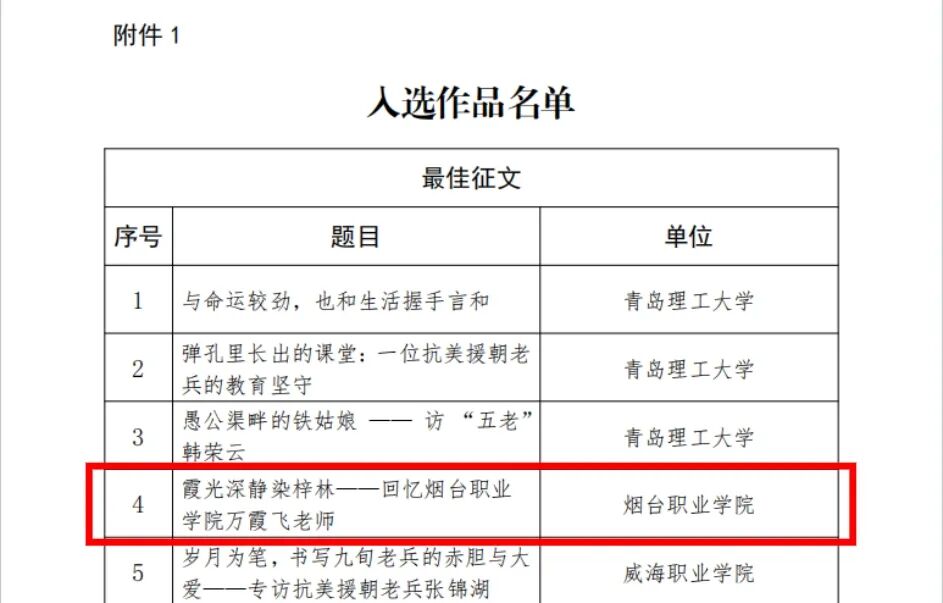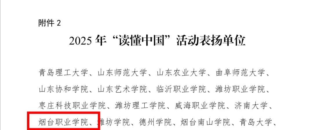 近日,山东省教育厅关工委发布《关于公布2025年“读懂中国”活动入选作品名单》,烟台职业学院推送征文《霞光深静染梓林—回忆烟台职业学院万霞飞老师》获“最佳征文”,学校获评“2025年‘读懂中国’活动表扬单位”。