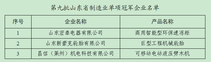 近日,山东省工业和信息化厅公布了第九批山东省制造业单项冠军企业名单,烟台共20家企业入选。莱州市山东宏泰电器有限公司、山东新豪克轮胎有限公司、昌信(莱州)机电科技有限公司3家企业入选。