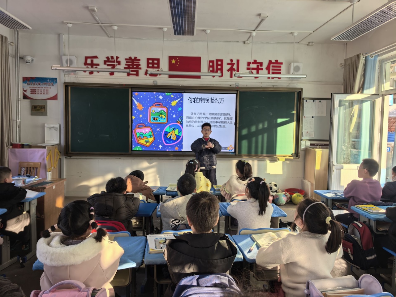 课堂从感受心跳开始。当同学们把手放在胸前,感受那稳定而有力的搏动时,老师轻轻提醒:“这是世界上独一无二、只属于你的生命节奏。”随着这样的引导,孩子们开始了对自我的探索。他们观察自己身上独特的小记号,回忆那些只有自己经历过的趣事,也发现自己平时没有注意到的“小本领”。在欢笑与分享中,每个孩子逐渐意识到:我是独一无二的,值得被看见、被珍惜。