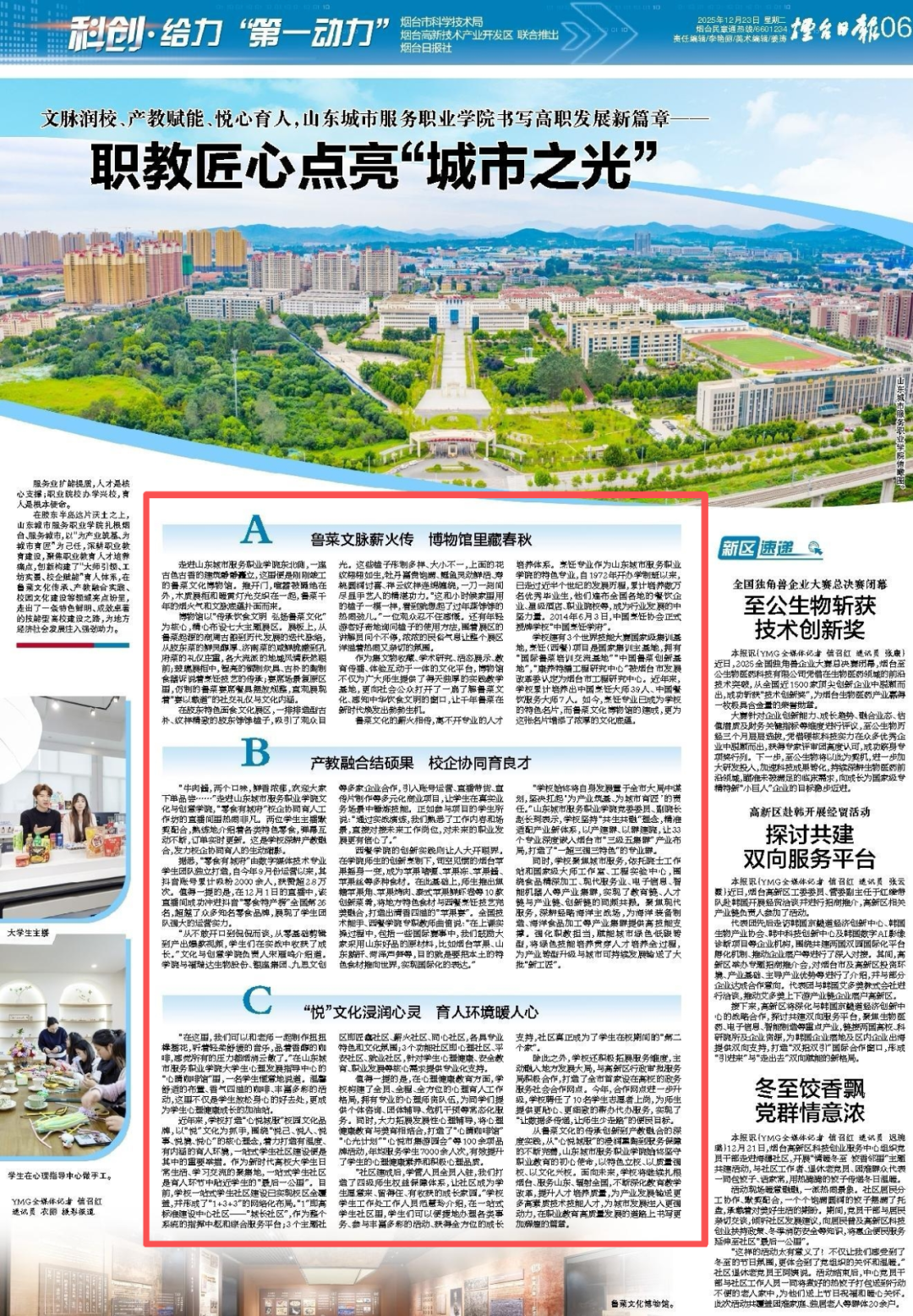 “学校始终将自身发展置于全市大局中谋划,坚决扛起'为产业筑基、为城市育匠'的责任。”山东城市服务职业学院党委委员、副院长赵长珂表示,学校坚持“共生共融”理念,精准适配产业新体系,以产建群、以群建院,让33个专业深度嵌入烟台市“三级五集群”产业布局,打造了“一超三强三特色”的专业群。