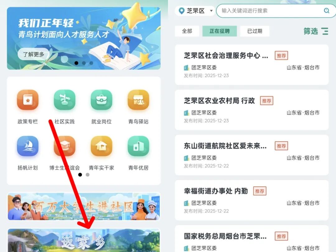 4.返回首页,定位“烟台市-芝罘区”,点击“返家乡”,即可查看心仪岗位,进行报名投递~