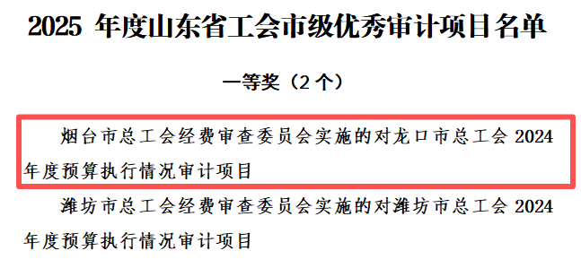 近日,山东省总工会经审会公布2025年度全省工会优秀审计项目评审结果。在此次全省范围的高标准评选中,烟台市选送的审计项目表现突出,斩获市级与县级层面“双第一”,成为全省唯一获市县“双冠”地市。