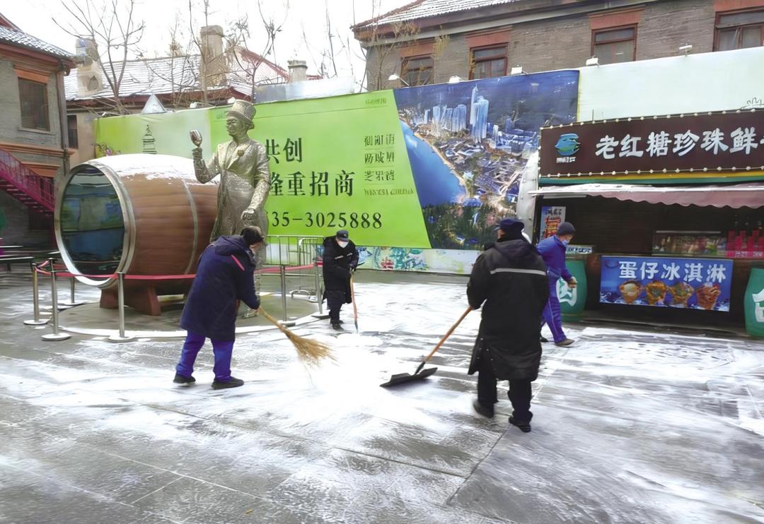 24日夜间到25日中午,烟台迎来降雪天气。烟台蓝天智慧物业、城管队员迅速行动,清雪防滑保畅通。记者 杨春娜 通讯员 袁磊 焦斐然 摄