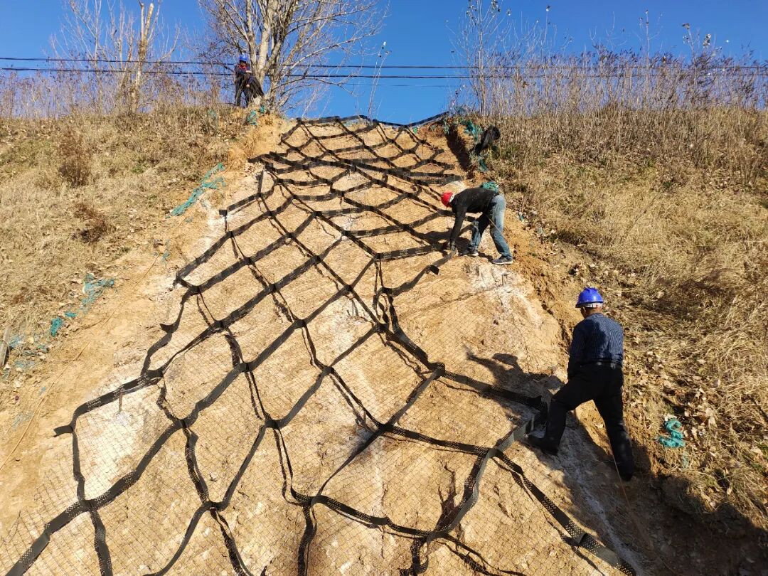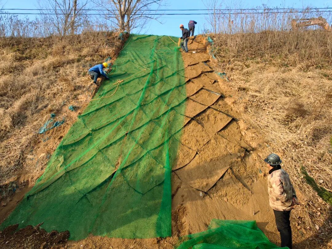 施工期间,为维持坡面稳固,贴近表层选择热镀锌弧形钢丝网全面覆盖,利用钢钎从上至下顺次固定,使其与坡面成为稳固的一体结构。覆盖完成后,再由上而下放置土工格,每格都与下层网面进行固定连接,形成规则整齐、结构稳定的菱形网格室,内部填充疏松壤土,加盖绿色三维植被网,固住坡体填充土壤。