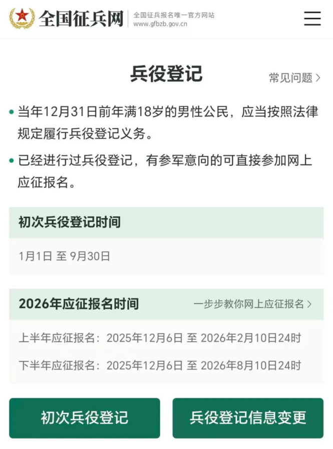 进行兵役登记后,如果有意愿在2026年应征报名的,可在全国征兵网上直接进行2026年应征报名。也可以在下面时间段内,再次登录全国征兵网报名。应征报名时间上半年为2025年12月6日至2026年2月10日;下半年为2025年12月6日至2026年8月10日。