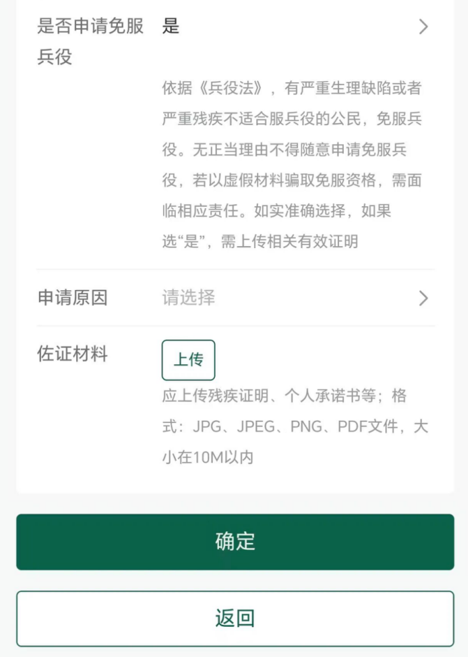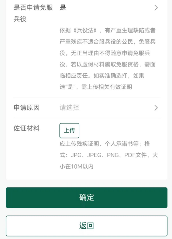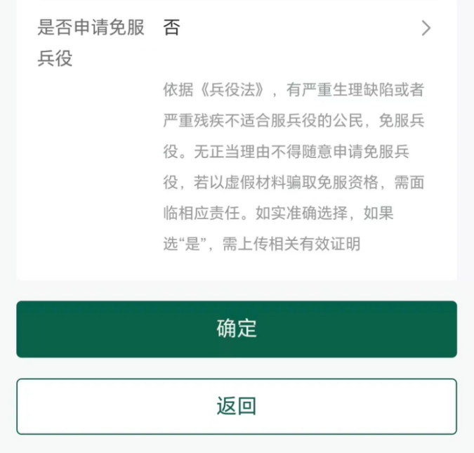 最后就是2026年新增的一项内容——“是否申请免服兵役”,如果身体健康的填“否”,就是符合服兵役条件,如果个人有服兵役意愿,需要在“义务兵征集”菜单里继续申请才能报名参军: