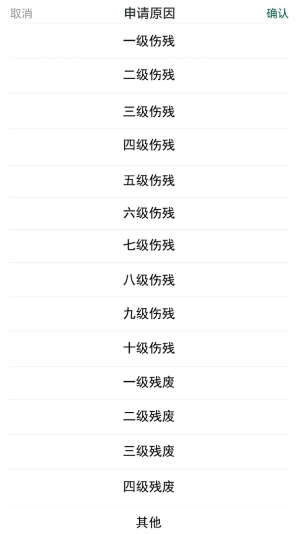 郑重提醒:在申请原因里选择下图中的伤残等级或者残废等级(最新兵役登记工作规定明确:政府有关部门对依照法律被剥夺政治权利的公民,应当作出不得服兵役的结论;对被鉴定为一级至四级伤残或者完全丧失劳动能力,或者被评定为一级至三级残疾等级的公民,应当作出免服兵役的结论。)。如有下面的身体情况请按相应级别填写,当然必须上传“佐证材料”