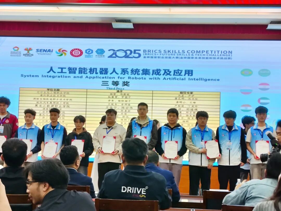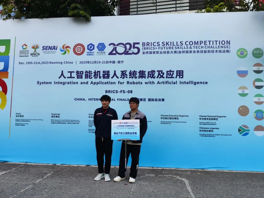 12月21日,2025 金砖国家职业技能大赛(金砖国家未来技能和技术挑战赛)人工智能机器人系统集成及应用赛项国际总决赛在南宁职业技术大学圆满落幕。烟台汽车工程职业学院参赛团队凭借扎实的专业功底、默契的协作配合与出色的临场发挥,从来自中国、泰国、越南、印度、印度尼西亚等多个国家和地区的 58 支参赛队伍中脱颖而出,成功斩获中国赛区三等奖。
