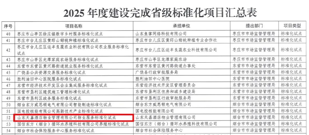 近日,从山东省市场监督管理局获悉,烟台高新区“山东天嘉酒店物业管理有限公司物业服务标准化试点”顺利通过审核,建设完成,这是全区标准引领高质量发展的又一关键成果。