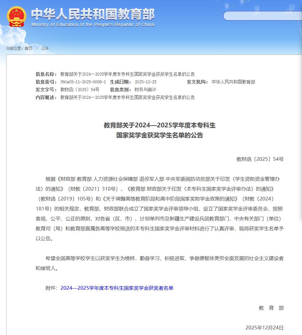 根据相关规定,教育部、财政部联合成立了国家奖学金评审领导小组,设立了国家奖学金评审委员会,按照客观、公平、公正的原则,对各省(区、市)、计划单列市及新疆生产建设兵团教育部门,中央有关部门(单位)教育司(局)和教育部直属各高等学校报送的本专科生国家奖学金评审材料进行了认真评审,最终确定名单。