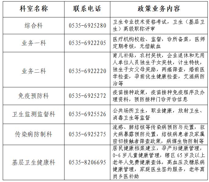 为更好地畅通联系渠道、方便群众办事,现将局机关各职能科室联系电话及可咨询的主要政策业务进行公示。新的一年,烟台高新区卫生健康局将一如既往耐心细致做好卫生健康领域服务工作。元旦即将来临,预祝广大居民朋友在新的一年福泰安康、马跃新程!