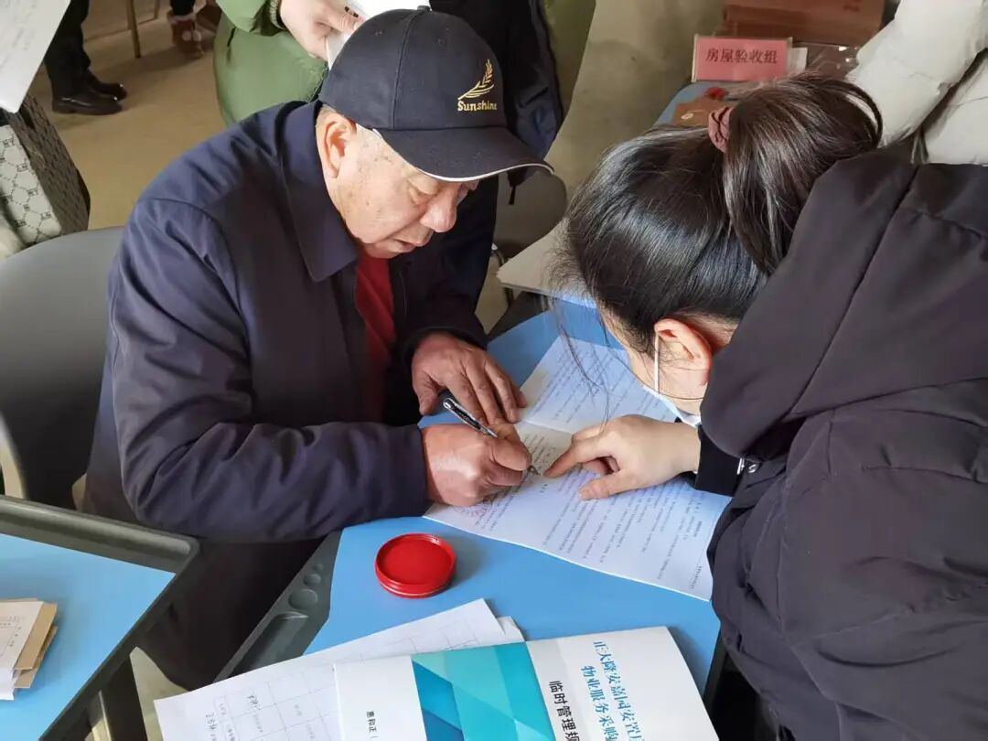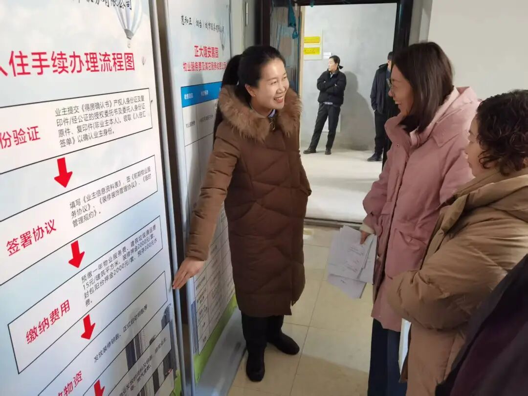 在分房现场,除了选房的村民,还有一群“自家人”在忙前忙后——惠和正(烟台)城市服务有限公司的物业工作人员正主动向居民介绍未来物业服务的具体内容,并陪同居民逐户验房,对水电、门窗等设施进行细致的现场讲解与检查。
