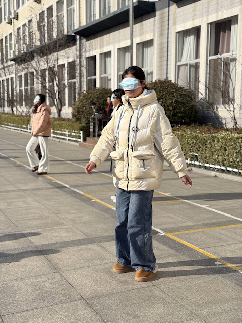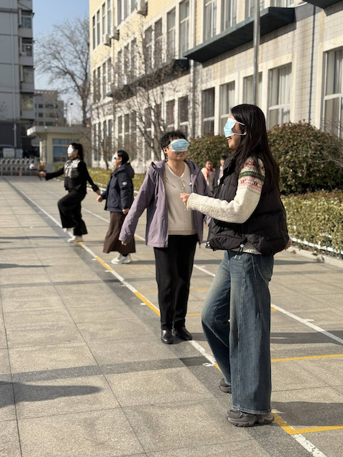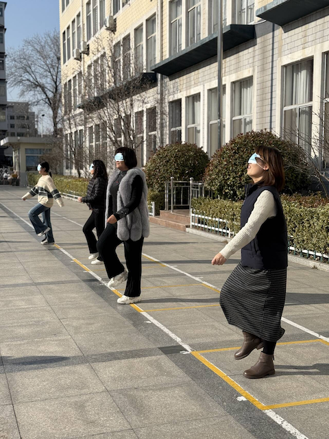 本次比赛创意新颖,参赛教师四人一组,蒙上眼罩,在划定的圆圈内完成一分钟原地踏步。既要保持节奏,又要稳住身形不踏出边线,十分考验平衡感与专注力。