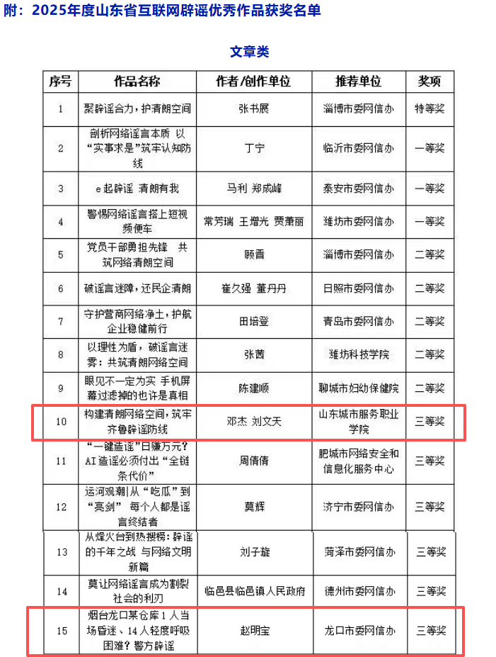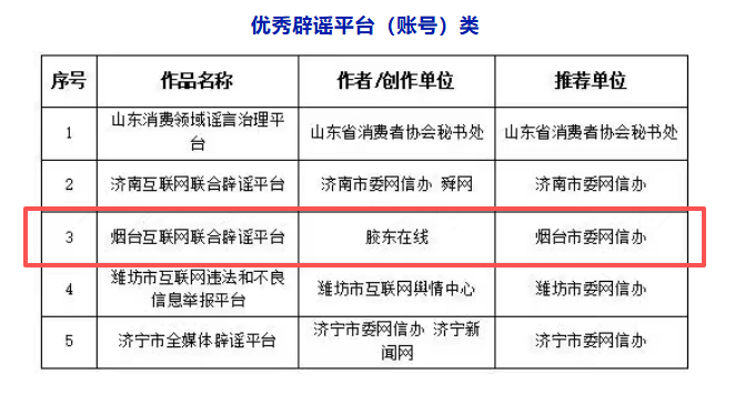 近日,2025年度山东省互联网辟谣优秀获奖作品名单揭晓。山东省互联网辟谣优秀作品分为文章类、平面类、音视频类、重大专题类和优秀辟谣平台(账号)五大类。自今年7月启动作品征集以来,受到各地各部门及广大网民的广泛关注和积极参与,共征集到作品1187件,经合规性审核、初评、专家终评等环节,最终推选出61件优秀辟谣作品。其中,烟台获二等奖1项、三等奖2项,“烟台互联网联合辟谣平台”被评为优秀辟谣平台(账号)。